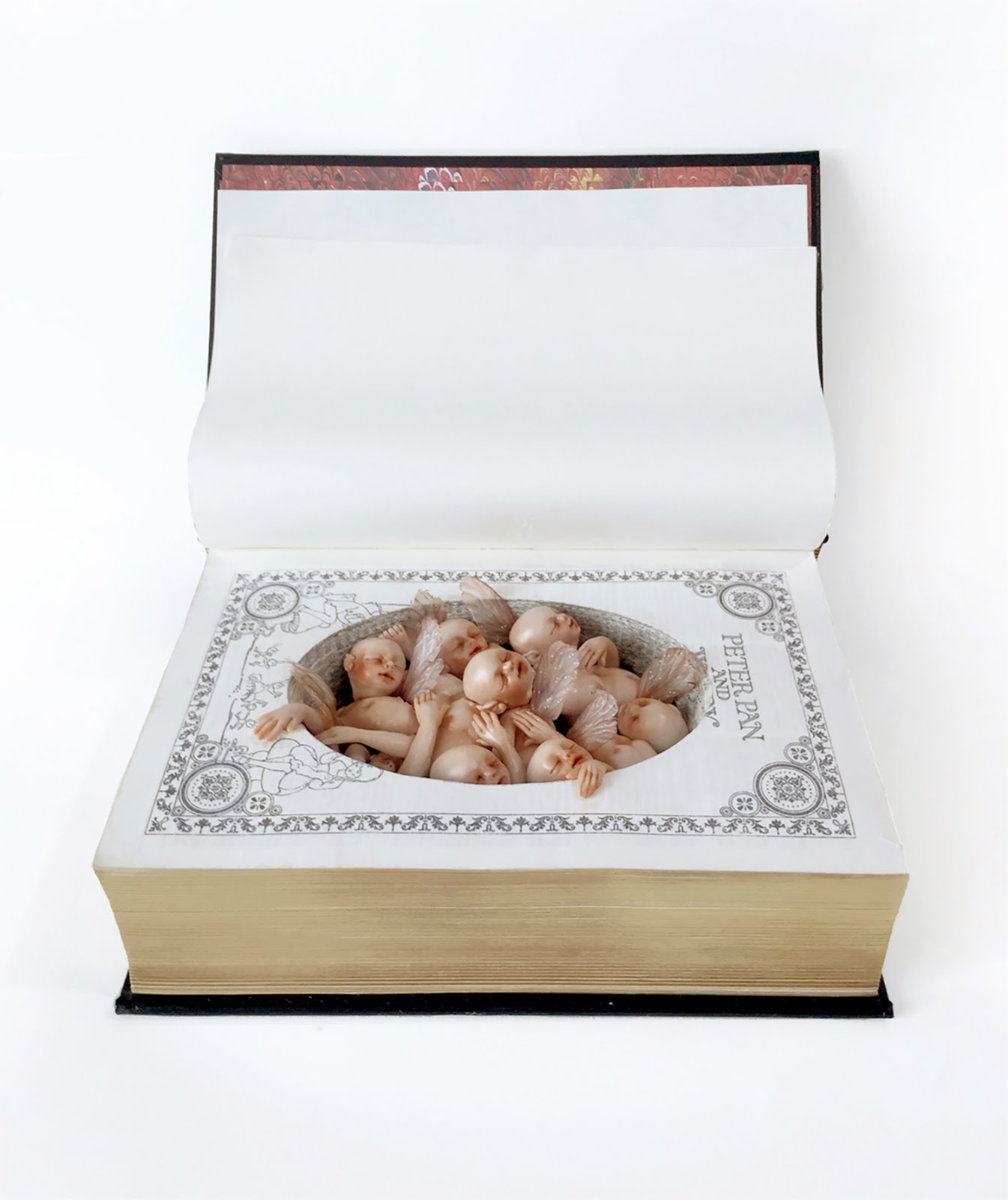 Qimmyshimmy is a designer and “accidental sculptor” from Singapore (currently based in the Netherlands) who has been gaining attention on Instagram due to her creepy-cute subject matter: particularly, the tiny sleeping babies and disembodied human hearts she’s been sculpting. With soft skin and sleeping faces, the babies look quite endearing—except that Qimmyshimmy often arranges them in ways that invoke our curiosity and unease; for example, their heads are occasionally detached and stuffed into gumball machines or pill packets. The exposed hearts are disconcerting for more obvious reasons, but in everything she creates, Qimmyshimmy has a way of exposing the beauty and discomfort of vulnerability.
